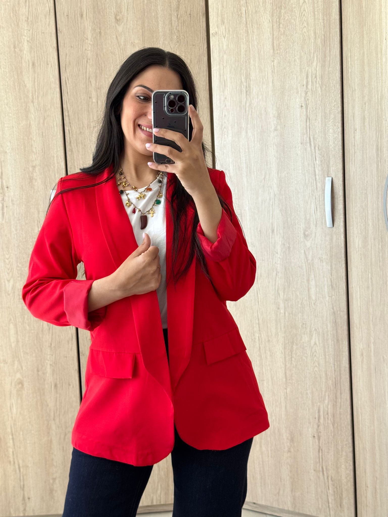 Chaqueta tipo blazer con cuello tipo solapa abierta sin botones ideal para looks casuales o formales.