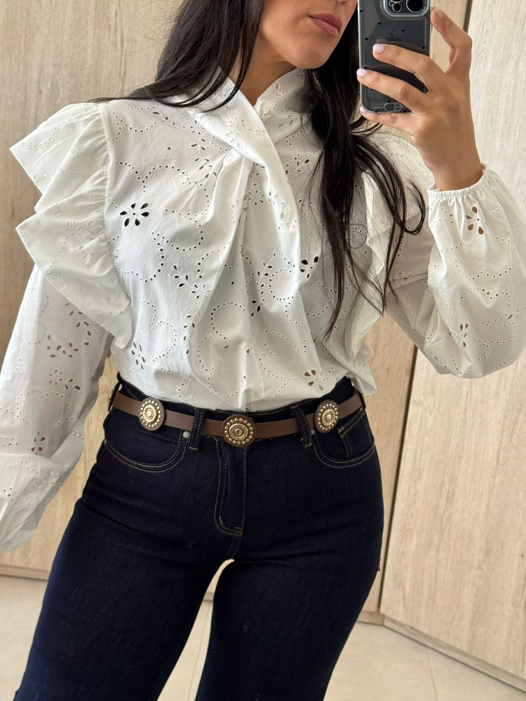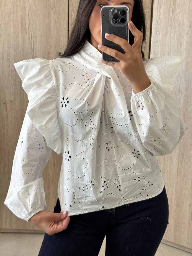 Camisa blanca con tejido de flores, tiene unos volantes en la zona delantera. Manga larga con elástico en el puño.