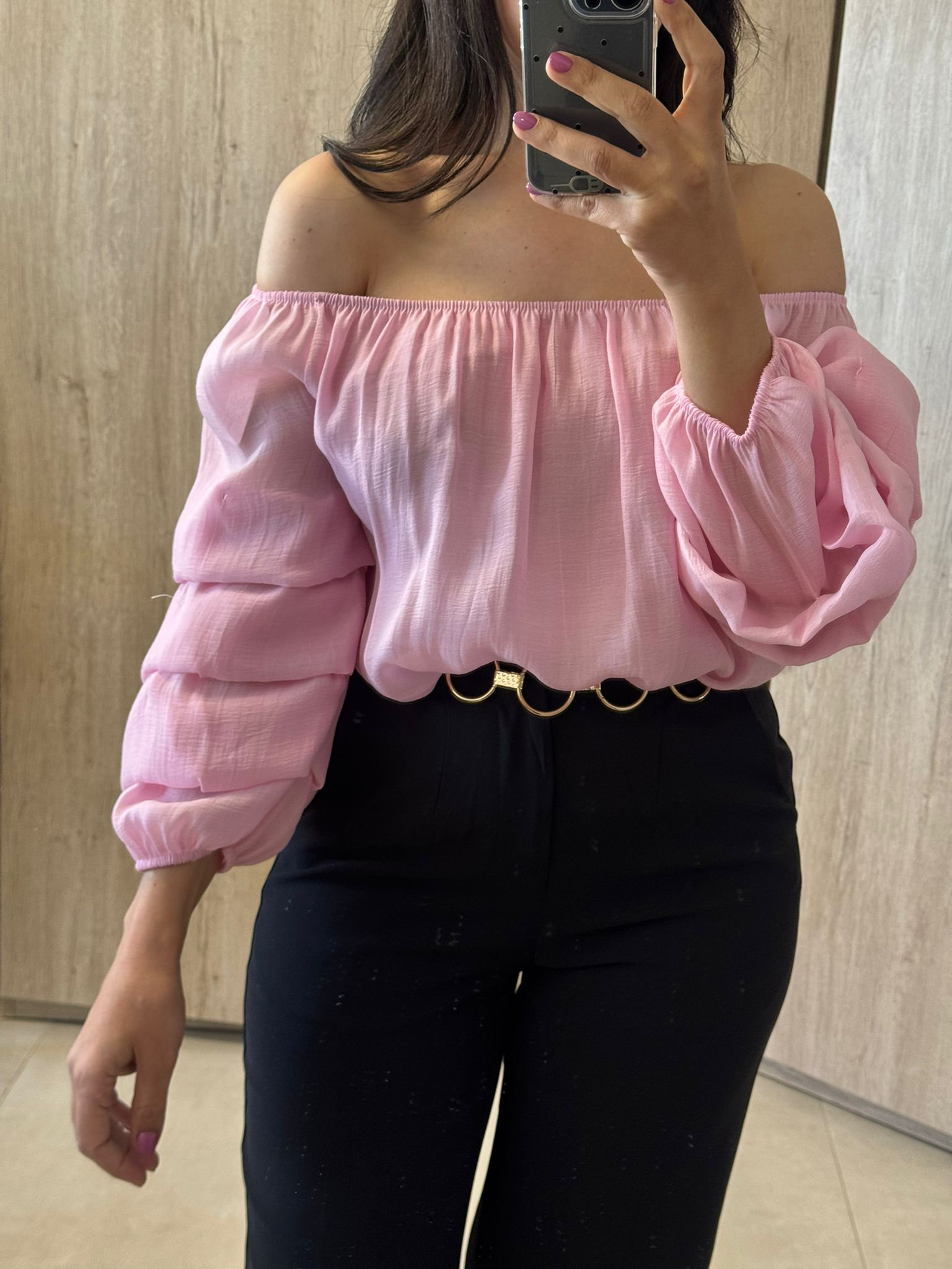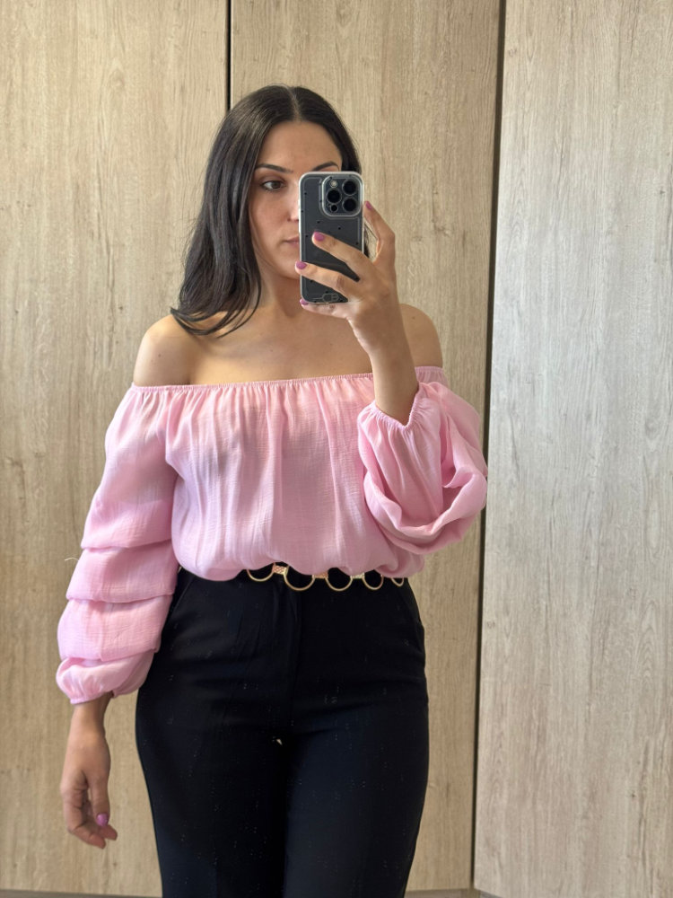 Blusa off shoulder en tono rosa suave, con mangas largas abullonadas que aportan un estilo femenino y romántico. Su diseño ligero y fresco la hace perfecta para looks casuales o más elegantes, ideal para resaltar los hombros con un toque delicado y moderno.