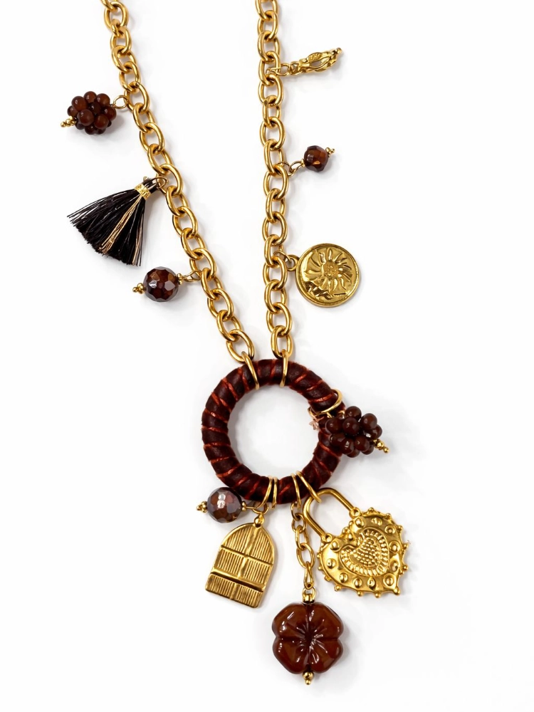 Collar de acero inoxidable, marrón chocolate con charms colgantes de diferentes estilos.