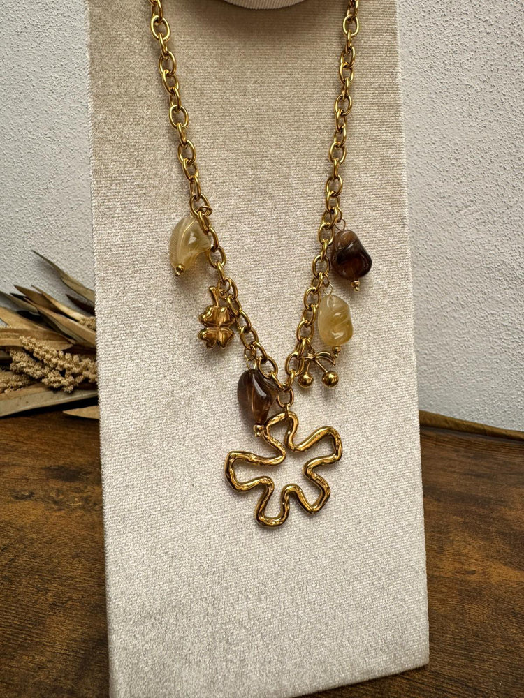 Su cadena de eslabones sostiene un elegante dije en forma de flor, acompañado de pequeñas piedras en tonos cálidos que aportan textura y un toque orgánico único.