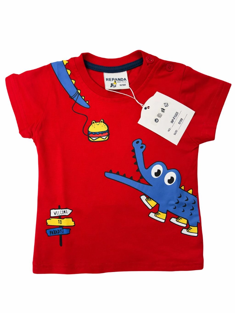 Conjunto de dos piezas en incluye camiseta de manga corta en color rojo con estampado de cocodrilo. Además se complementa con pantalón corto con cintura elástica.