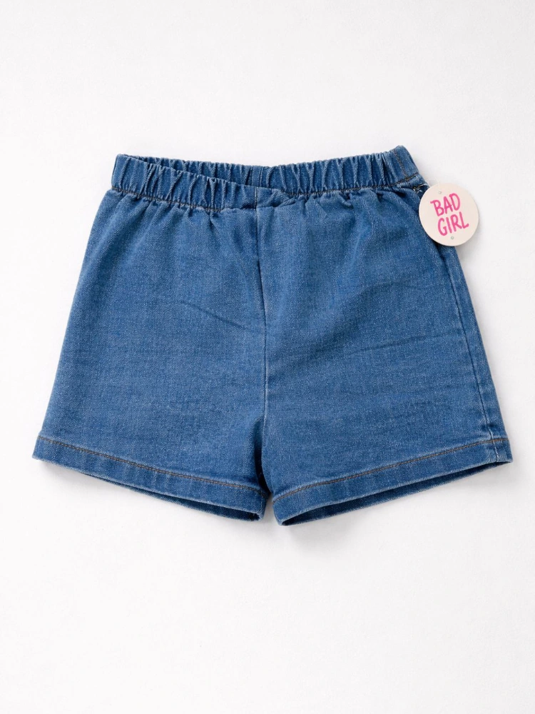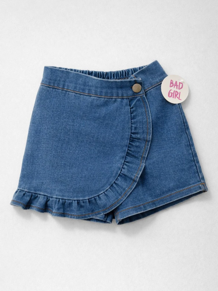 Conjunto de dos piezas que incluye camiseta blanca con manga bordada y falda pantalón vaquera con volante asimétrico en la parte delantera y cintura elástica.