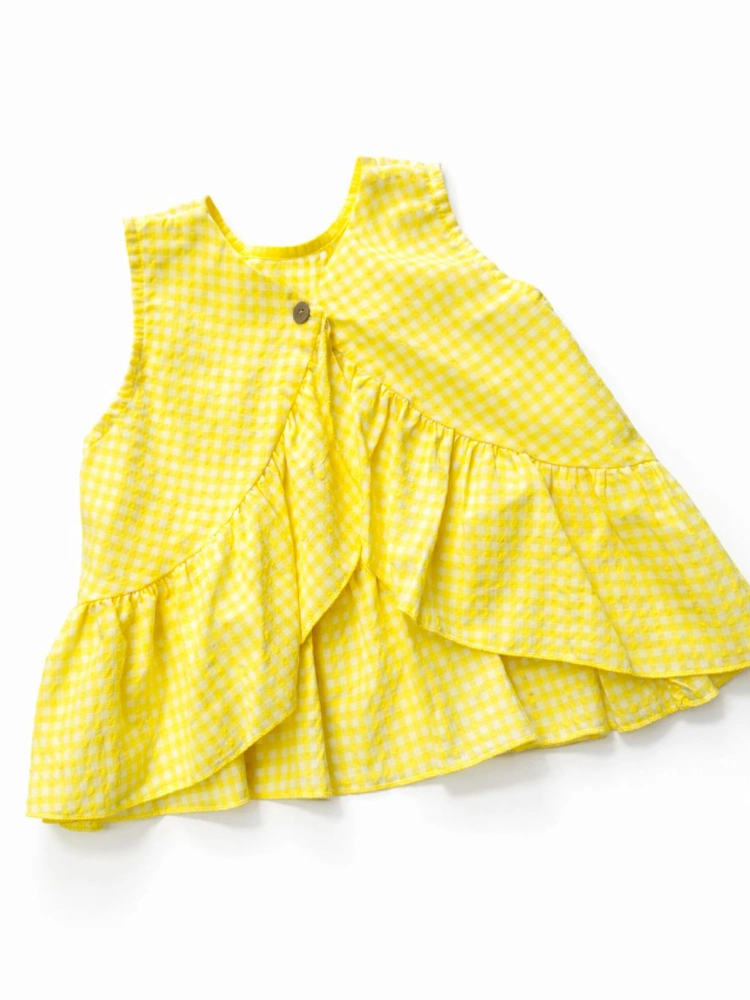 Este conjunto incluye blusa sin mangas con un diseño cruzado por la espalda, detalle del botón y volantes asimétricos que aportan movimiento y un toque único.