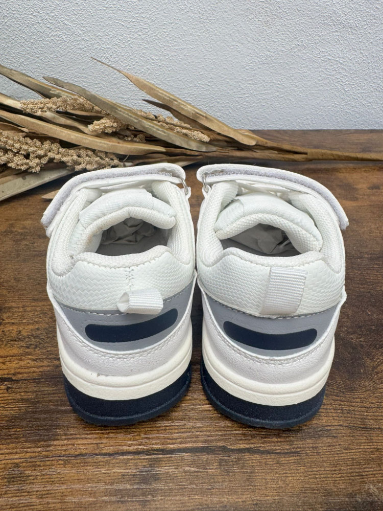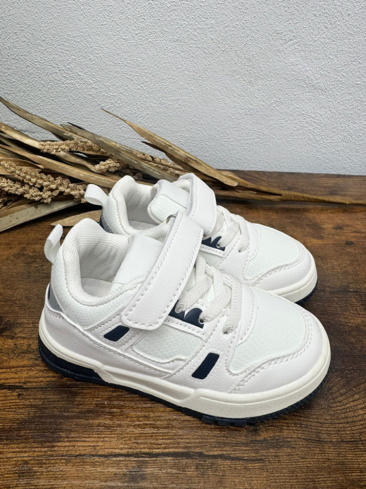 Deportiva en color blanco con detalles en azul marino. Cierre con velcro.