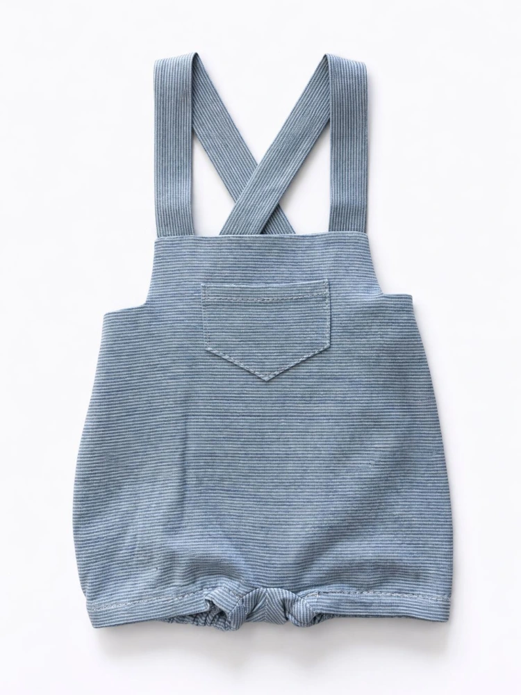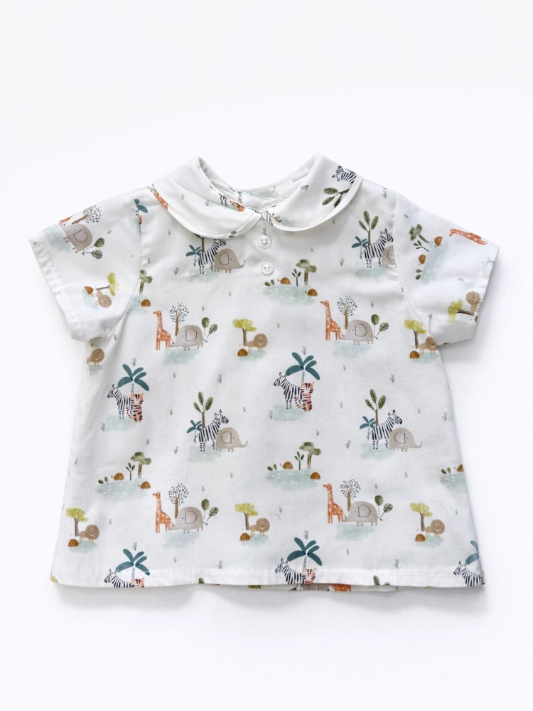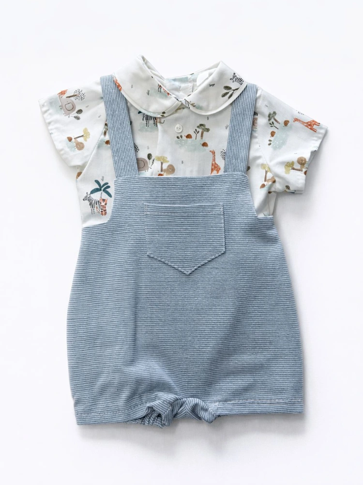 Conjunto de dos piezas que incluye peto de rayas y camisa con estampado de animales.