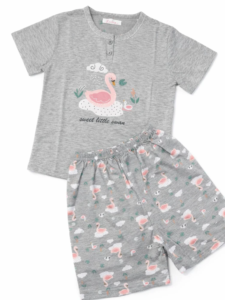 Conjunto de pijama de verano de niña con estampado de cisnes , compuesto por camiseta de manga corta y pantalón corto.