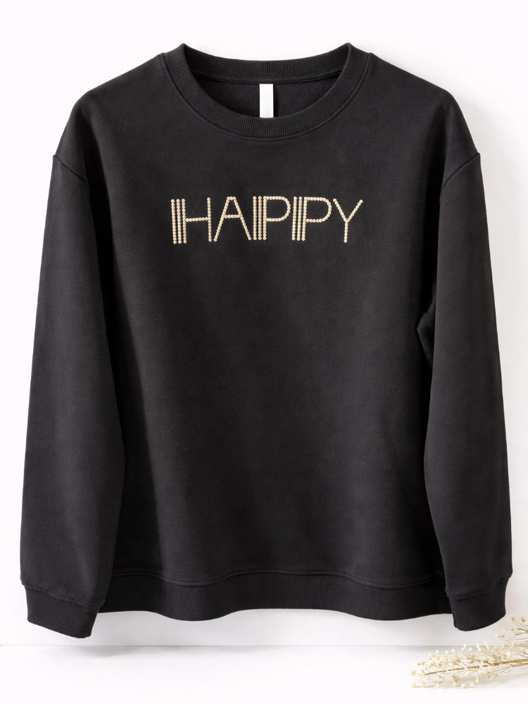 Sudadera caballero con cuello redondo con la palabra Happy estampada.