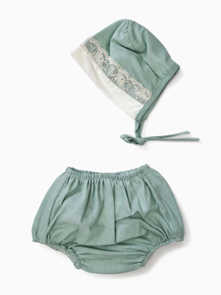 Vestido de ceremonia en tonos verde agua y beige, incluye capota y braguitas en verde agua.