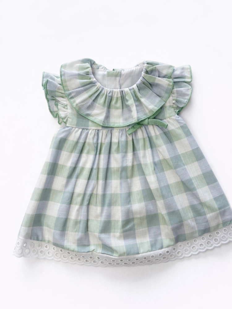 Vestido de cuadros en tonos verde agua y celeste con el detalle del volante en la parte del cuello y las mangas y bajo con tira bordada blanca.