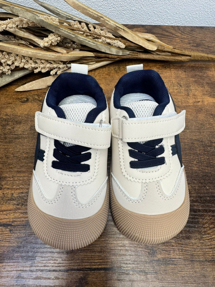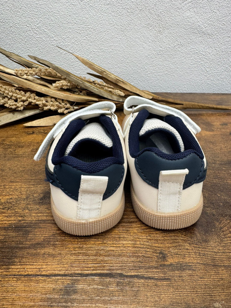 Zapatilla respetuosas en tonos beige y azules. Cierre con velcro.