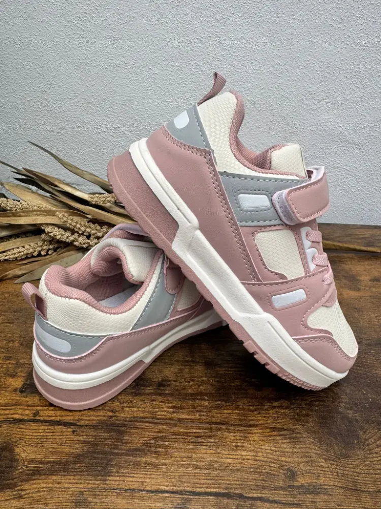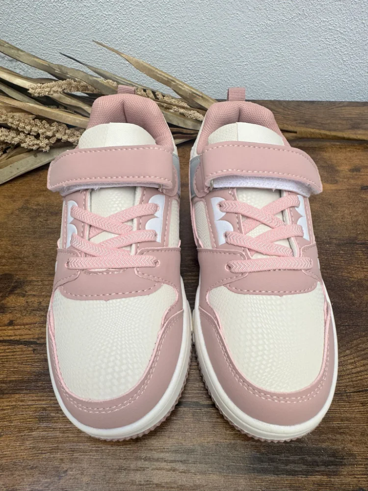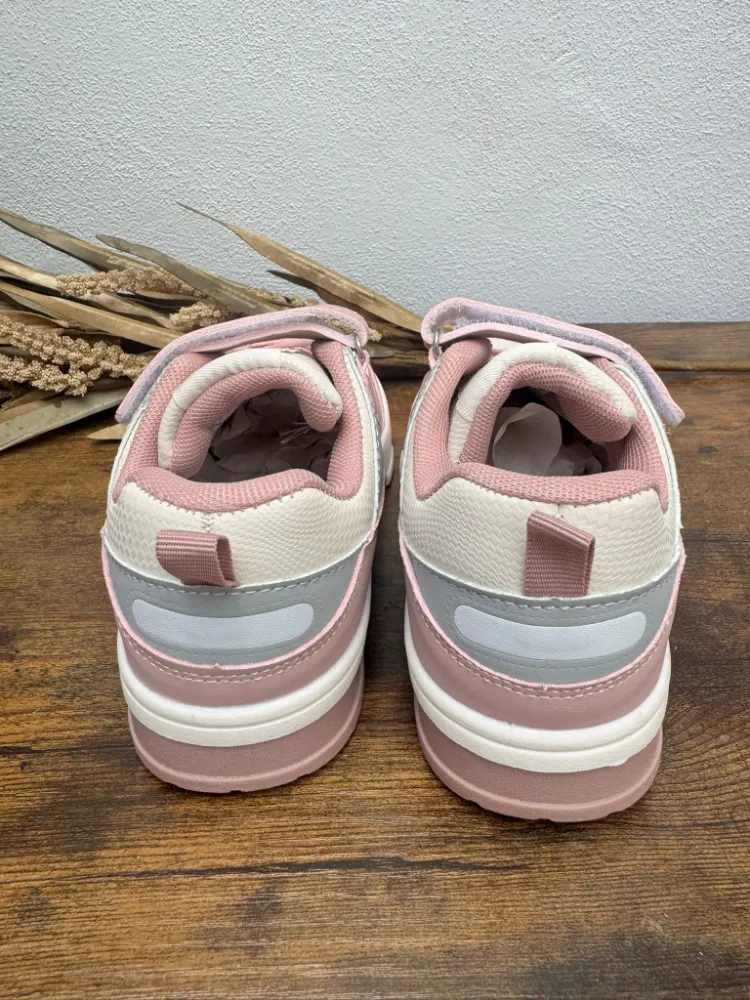 Zapatilla deportiva en tonos rosa y beige con reflejos en gris. Cierre con velcro.